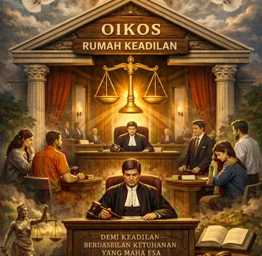 Pengadilan sebagai oikos atau rumah keadilan, yakni ruang bermartabat yang menerima setiap subjek hukum untuk menemukan kebenaran dan keadilan melalui hukum yang ditegakkan secara adil, seimbang, dan manusiawi. Hakim ditempatkan sebagai penanggung jawab utama rumah keadilan yang wajib menegakkan hukum dengan integritas, ilmu pengetahuan, dan hati nurani berdasarkan prinsip “Demi Keadilan Berdasarkan Ketuhanan Yang Maha Esa.”